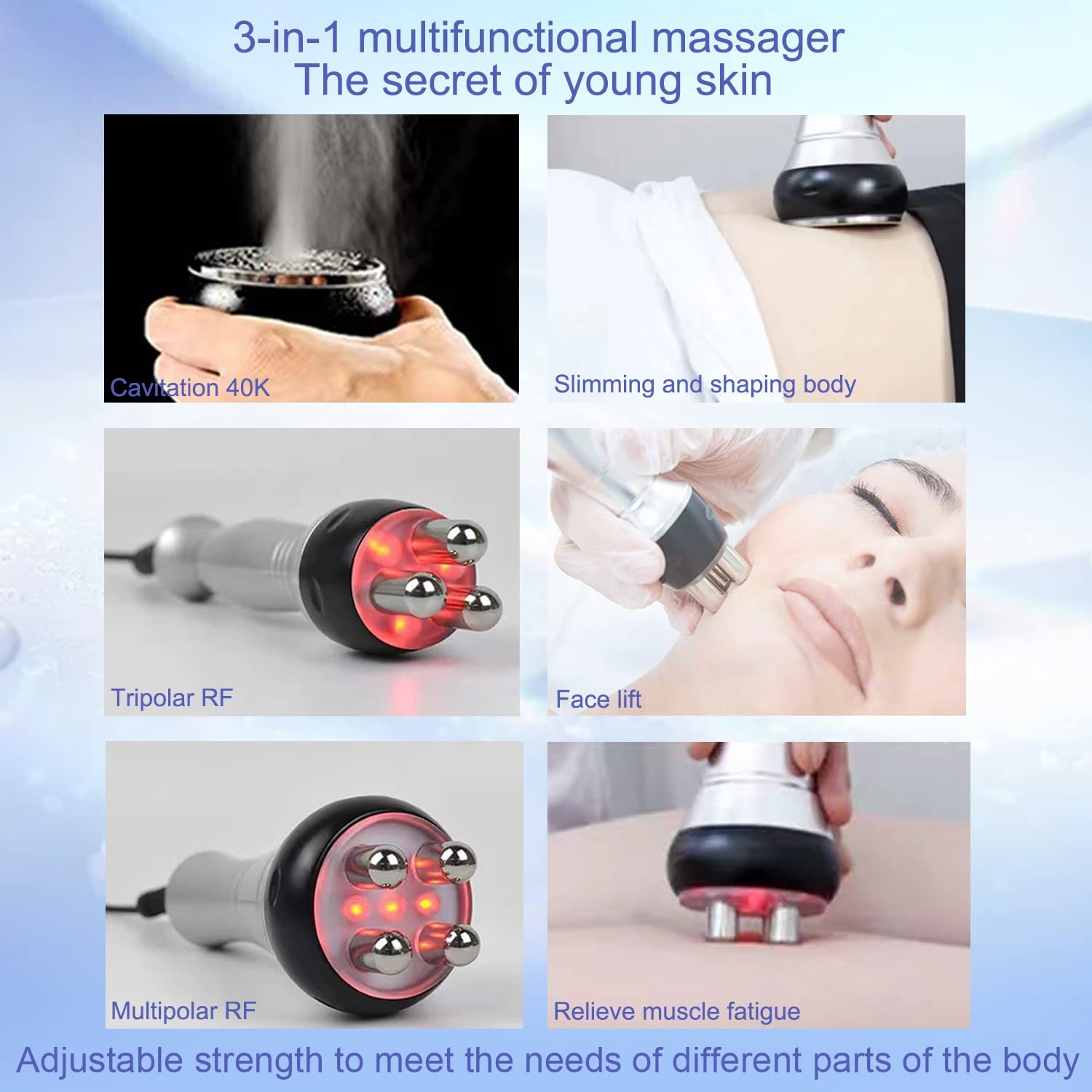 Main effects: Remove facial wrinkle, dilute facial freckles, eliminate extra fat cellulite, the skin gets whiter and smooth; firm eye skin, smooth eye wrinkle, fade eye black circle;shrink pores, tighten loose skin, remove double chin; promote metabolism, enhances luminosity of the skin.