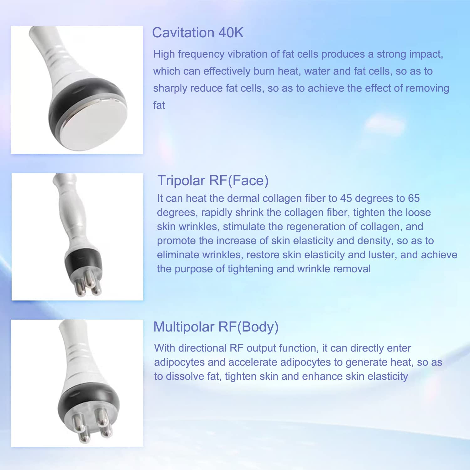 Quadpupolar FR head: Advanced four-pole cycle radio frequency technology, in a second can be the site of the regulation of the electrical field in the biological tissue electrode change millions of times, the natural resistance of subcutaneous tissue to generate heat, heat stimulation of the dermis layer secrete more new collagen. Fill the vacancy of collagen, and then hold up the skin bracket again, restore skin elasticity.
