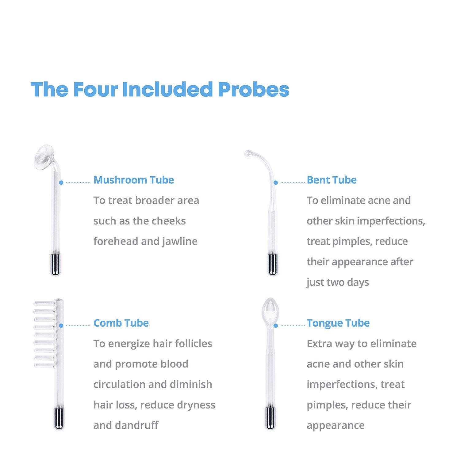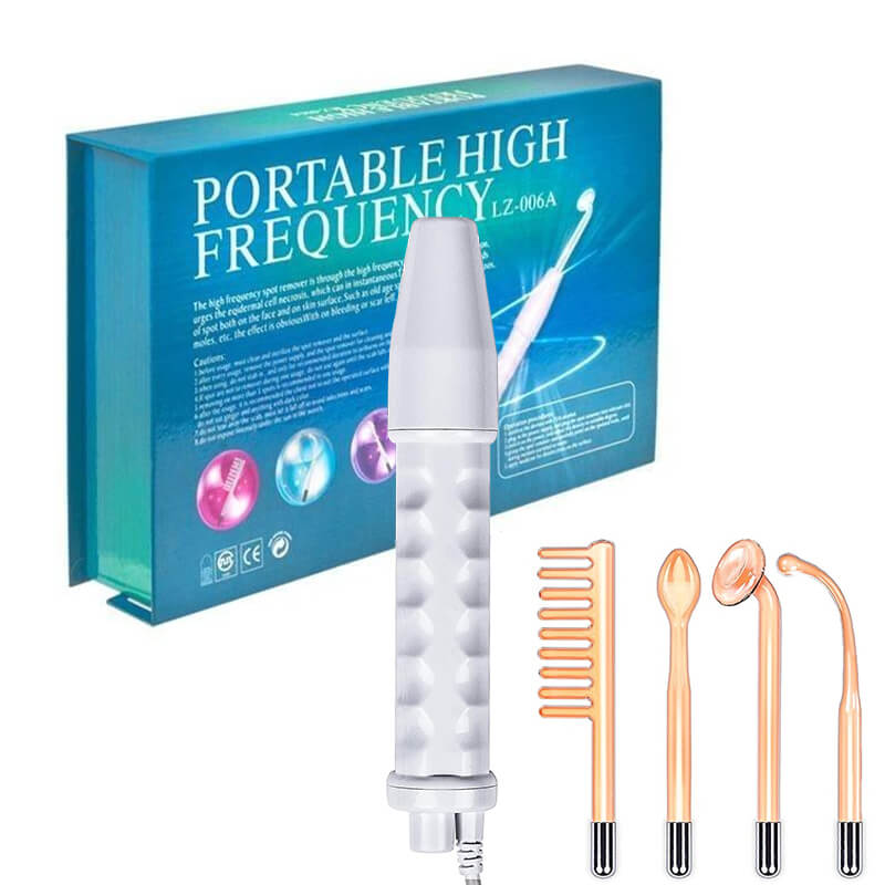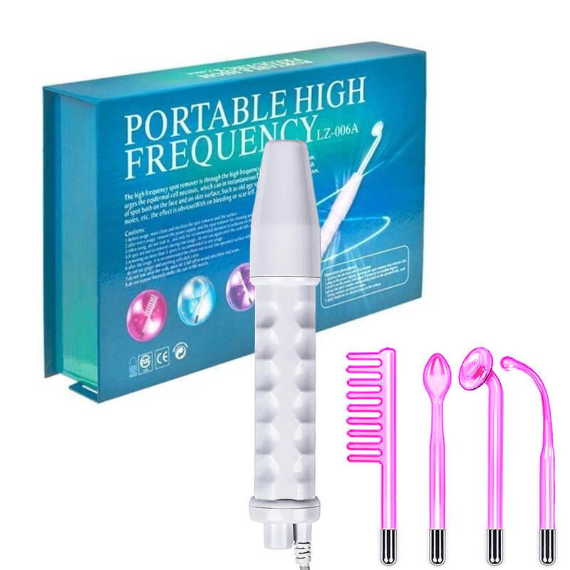 What's in the Box – 1 High Frequency Handle, Neon powered mushroom wand, Neon powered bent wand, Neon powered comb wand, neon powered tongue wand, quick-start treatment guides, instruction.